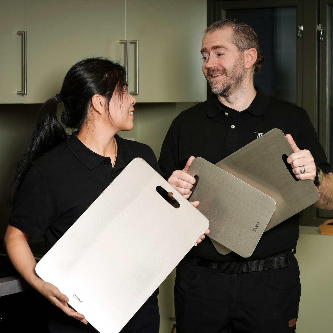 Tommy og hans kone Emily, grunnleggerne av Titano, deler en lidenskap for å skape kjøkkenverktøy som er trygge, bærekraftige og laget for å vare. Tommy, en tidligere sveiser med over 20 års erfaring med forskjellige materialer, kombinerte sin ekspertise med Emilys øye for design for å bringe Titano™ til live. Frustrert over begrensningene ved tradisjonelle skjærebrett, satte de seg fore å designe en bedre løsning. Resultatet ble Titano™ Skjærebrettet, laget av 100 % titan, som tilbyr eksepsjonell hygiene, holdbarhet og miljøansvar for moderne kjøkken.